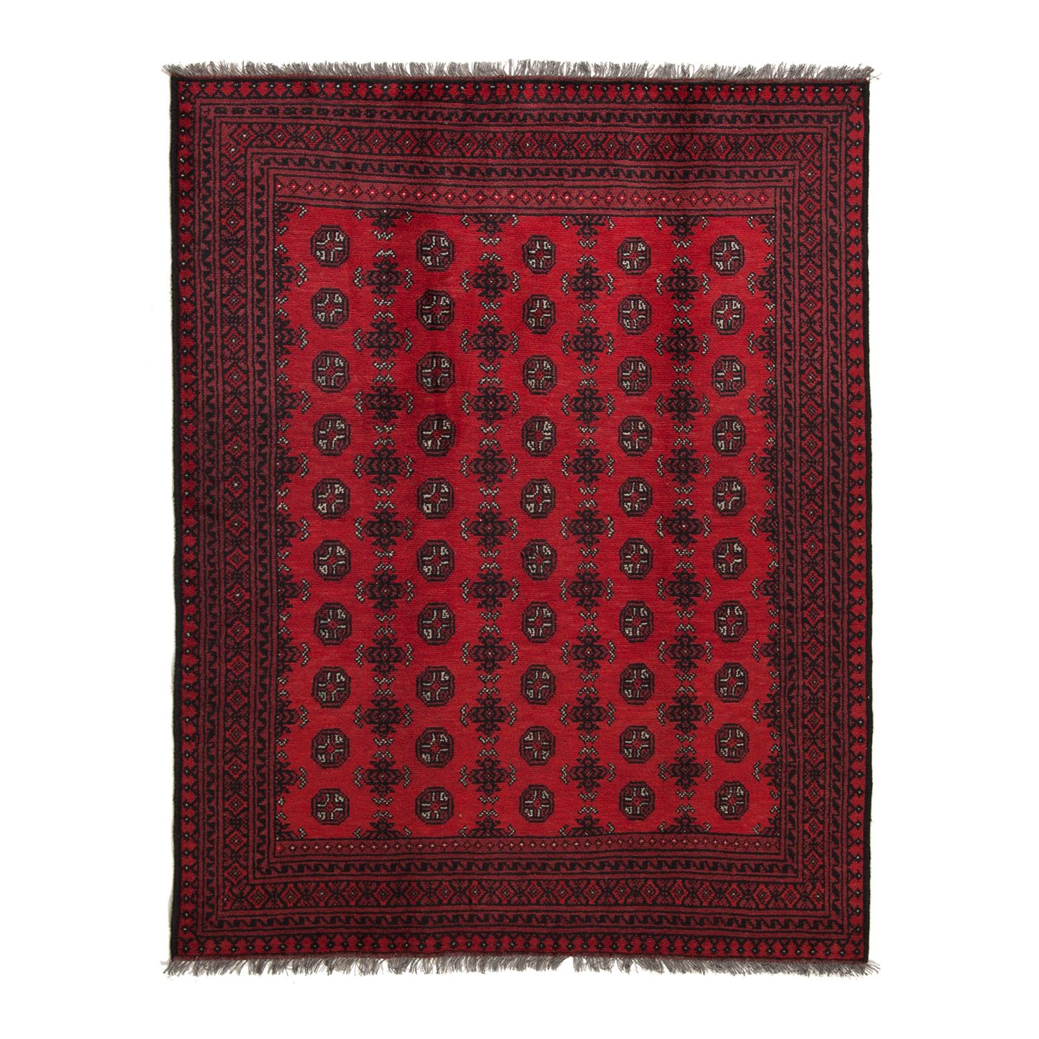 These are handmade carpets produced in Afghanistan by nomads. They are being woven traditionally with repeated patterns and are usually made in combinations of red, black and white colors. This family of carpets is manufactured by wool on wool and it has a red background color.