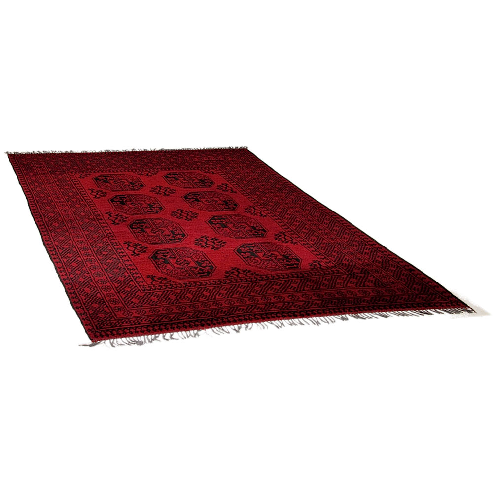 These are handmade carpets produced in Afghanistan by nomads. They are being woven traditionally with repeated patterns and are usually made in combinations of red, black and white colors. This family of carpets is manufactured by wool on wool and it has a red background color.